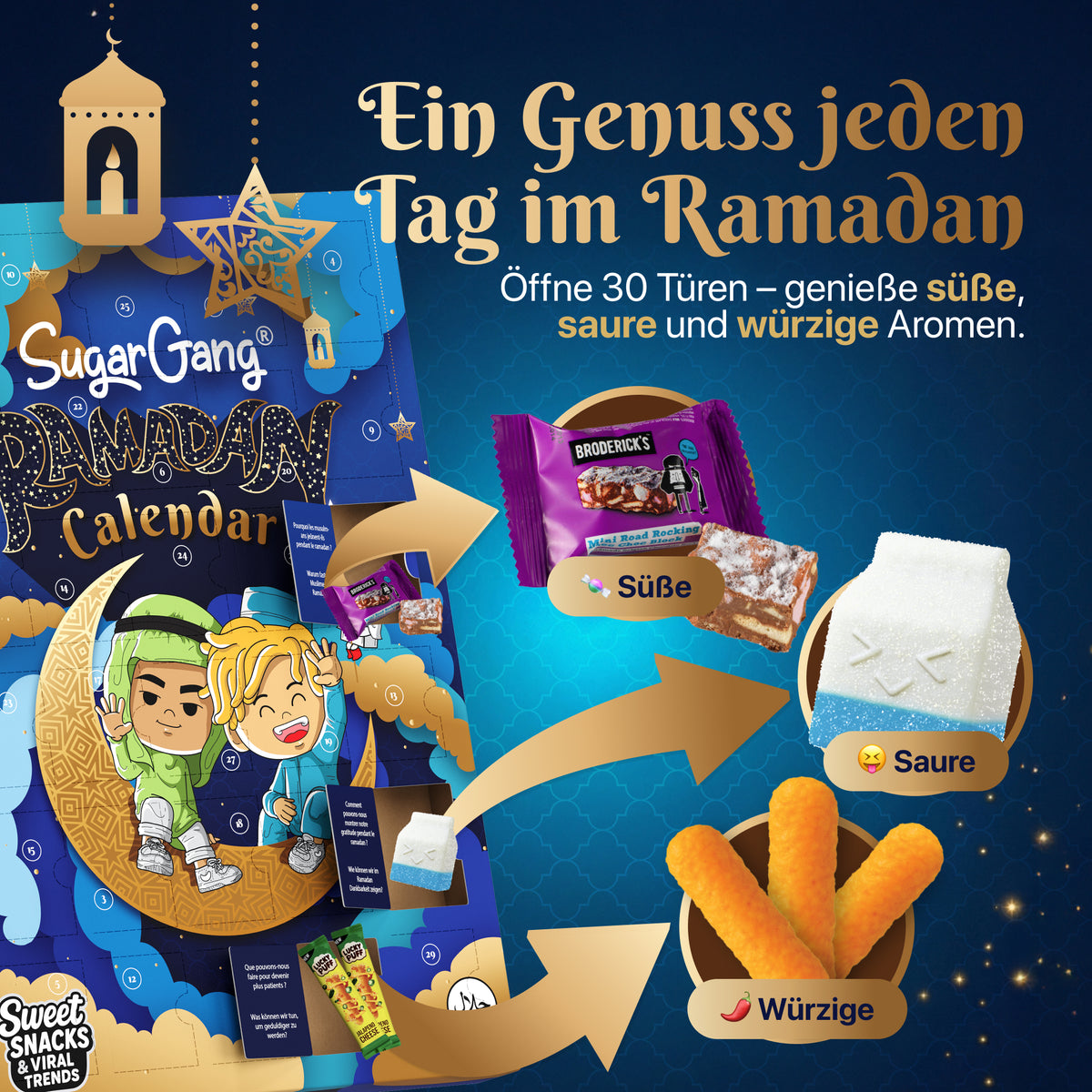 Freu dich auf 30 Halal-Highlights – süß, sauer und würzig – exklusiv zusammengestellt für diesen besonderen Monat. Hinter jedem Türchen wartet zusätzlich eine spannende Wissensfrage, die zum Nachdenken und Austauschen einlädt.