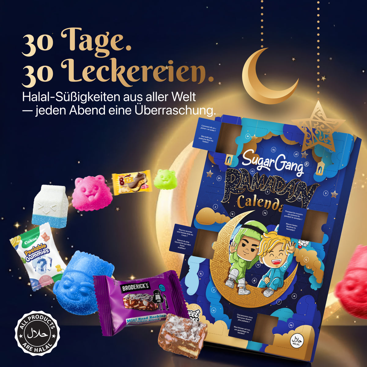 Wir haben den Inhalt unseres Ramadan Kalenders sehr sorgfältig ausgewählt und versichern, dass dieser zu 100% Halal ist. Bei Fragen zu diesem Thema, melde dich gerne bei unserem Support info@sugargang.com.